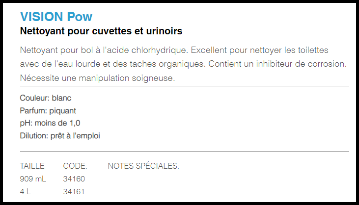 Nettoyant pour cuvette à l'acide chlorhydrique. Excellent pour nettoyer les toilettes avec de l'eau lourde et des taches organiques. Contient un inhibiteur de corrosion. Nécessite une manipulation soigneuse.