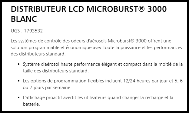 Les systèmes de contrôle des odeurs d'aérosols Microburst® 3000 offrent une solution rentable et programmable avec toute la puissance et les performances des distributeurs standards.